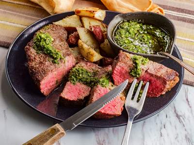 Skirt steak is a tender, flavorful cut of beef and is simple to cook. It needs only salt, pepper, and a very hot pan—just a few minutes on each side to reach a juicy medium rare. Skirt steak is its most tender when cooked medium rare, so if needed, use a meat thermometer to ensure it doesn’t overcook. Slice against the grain for optimum tenderness.