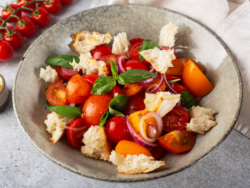 This popular Tuscan salad made of tomatoes and crunchy bread is a summer delight. The fresh flavors and textures are simply wonderful. Serve as a side or a light meal on its own. Allow a little time at the end to let the liquids absorb into the bread.